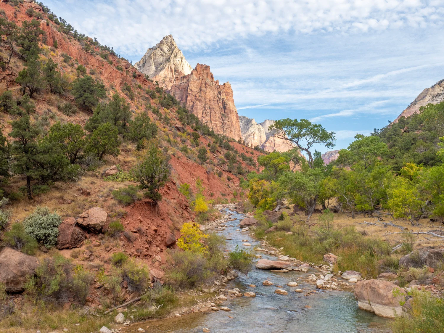 At the end of the Zion Scenic Drive is the Riverside Walk Trail which is a paved, flat, and absolutely beautiful walk along the Virgin River. This trail ends at the trailhead (river entrance) to start the Narrows Hike.